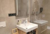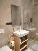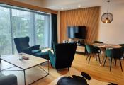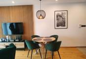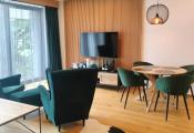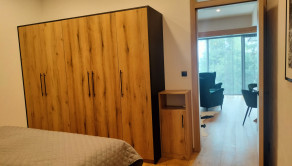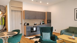 The apartment is part of an atypical 6-story multi-functional apartment building, set in a sloping terrain. The apartments themselves are located on individual floors. There are also common areas such as a ski room, warehouses, a technical room, and an elevator machine room. The northern entrance to the building is from the parking lot, where we get to the floor. From the south side of the green area, we reach the level - 2PP, where the offered apartment is also located. The apartment consists of two rooms and accessories, Kitchen - kitchenette with dining room ,bedroom, hall, bathroom with toilet. The entrance doors are fireproof, window constructions are large-area plastic with insulating triple glazing. Above-standard kitchen line based on wood. There is a built-in fiberglass cooking plate on the worktop, a pull-out hood. There are 2 stainless steel lever faucets in the kitchen sink, in the sink, and a shower faucet in the shower. There is a built-in wardrobe with sliding doors in the room. The floors in the living rooms are floating on a wood base, as well as the internal doors and door frames. Furnishings are of above-standard design, cable TV, internet and home telephone are installed in the apartment. This is an intelligent property, within the application it is possible to set the heating before arrival, or raise the garage ramp. The apartment is above standard, modern and purposefully furnished. The location of the apartment building is excellent, in the center of the city of Starý Smokovec in a quiet area with good accessibility on foot to civic amenities and the cable car boarding station. The floor area of the apartment is 54.53 m2. Part of the sale is also a co-ownership share in the Garage - garage space with an area of 29 m2.
